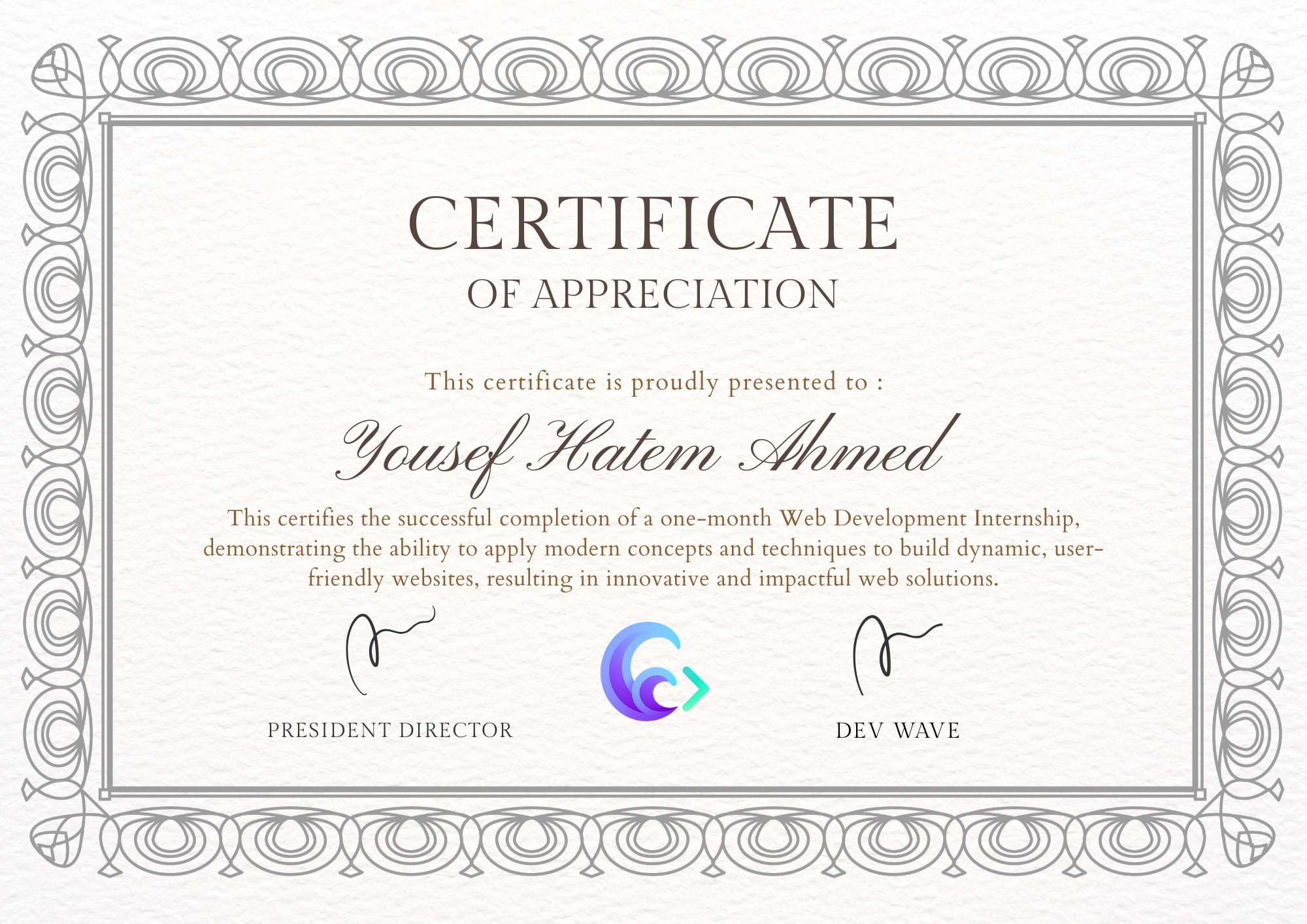 All certificates are verified and can be validated upon request. I'm committed to continuous learning and professional development in the ever-evolving field of web development.