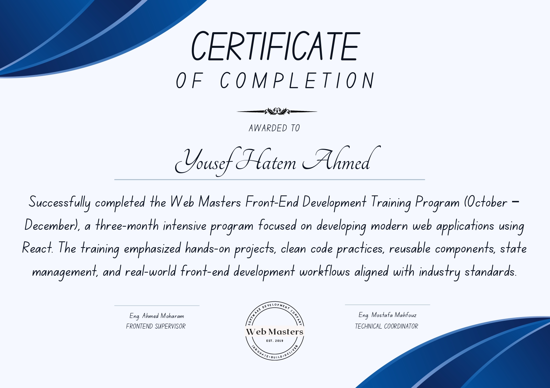 A collection of my professional certifications, training programs, and diplomas that showcase my continuous learning journey in frontend development.